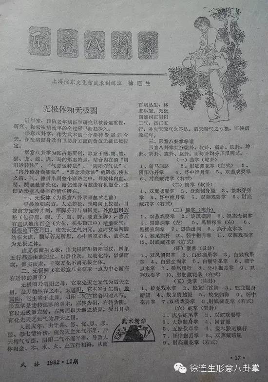 1982年至1983两年时间, 为了帮助广大武术爱好者了解学习形意八卦掌,徐连生老师编辑了形意八卦掌八大掌法套路、形意八卦掌对练以及撰写论述形意八卦掌的相关文章,连载刊登在《武林杂志》上,吸引了海内外众多的武术爱好者,更使全国各地的一些八卦掌爱好者不远百里千里,赶到上海学习。